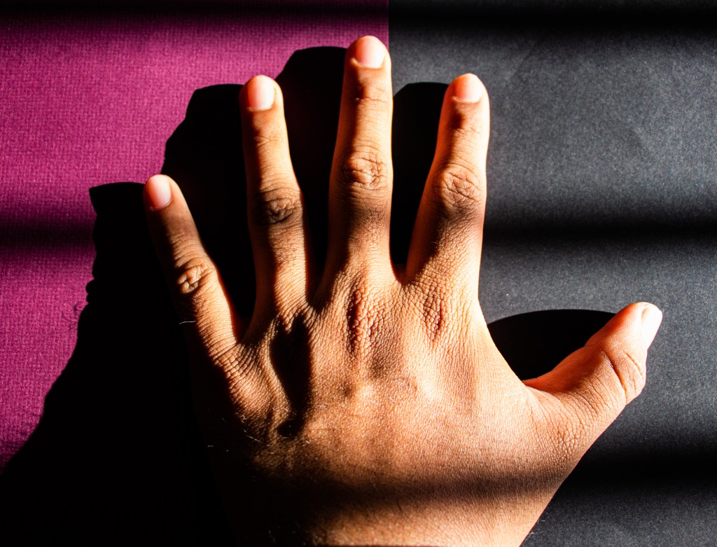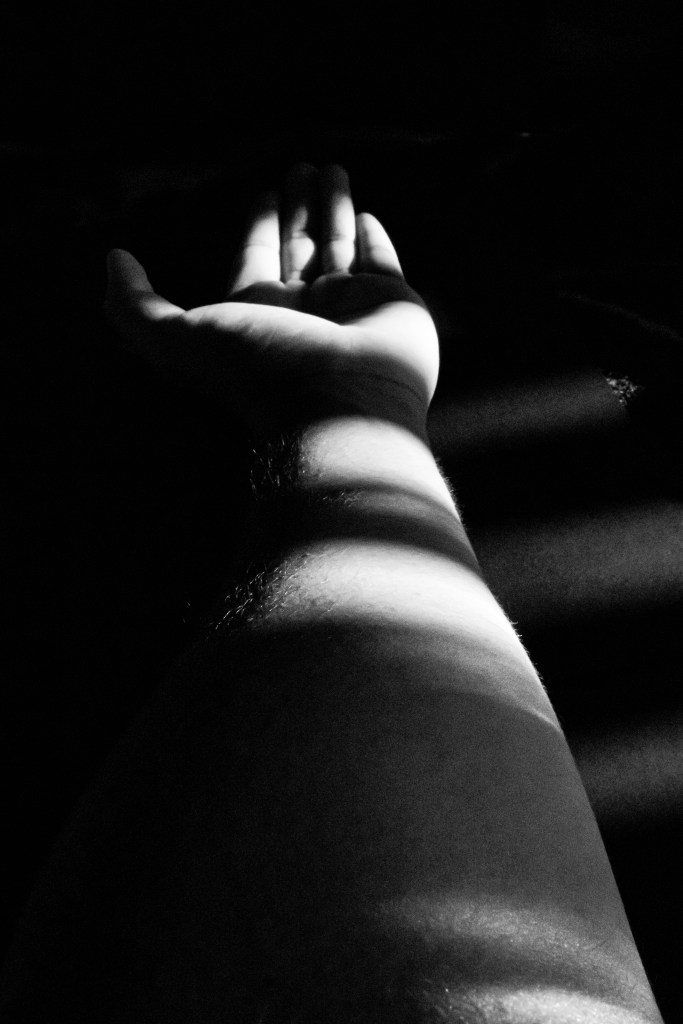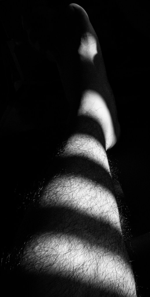 For this sketch I had to focus on Photographing the Body with texture and/or the nude with texture. I was very unsure whether I felt comfortable taking pictures of my body. I had second thoughts doing this because I have several scars on the back of my body that would’ve fulfilled this assignment. I didn’t end up doing it because it’s something personal to me very hard for me to show it to the public. Instead, I took some images that are part of my body. I focused on my hands, arms, and legs. I took these images on my bed because the window next to it had very good lighting. I also used the window blinds from my to create patterns and shadows. For the background I put black paper to make my body parts stand out. For the pictures of the hands I used another color to get a different perspective of it. The texture that you’ll often see are the hairs on my leg and the rough beat up hands that I have.